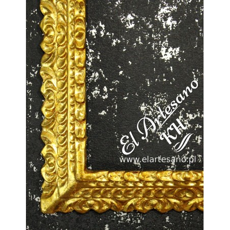 Elegante marco de madera de cedro con adornos tallados a mano. Dorado con pan de oro (shagmetal) con una precisa técnica de dorado.