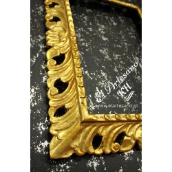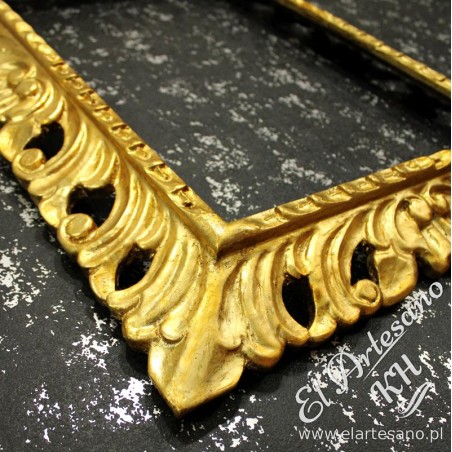 Elegante marco calado de madera de cedro con adornos tallados a mano. Dorado con pan de oro (shagmetal) con una precisa técnica de dorado.