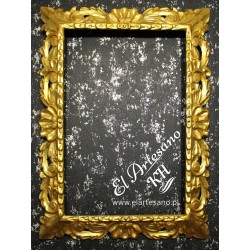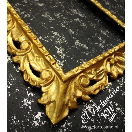 Elegante marco calado de madera de cedro con adornos tallados a mano. Dorado con pan de oro (shagmetal) con una precisa técnica de dorado.