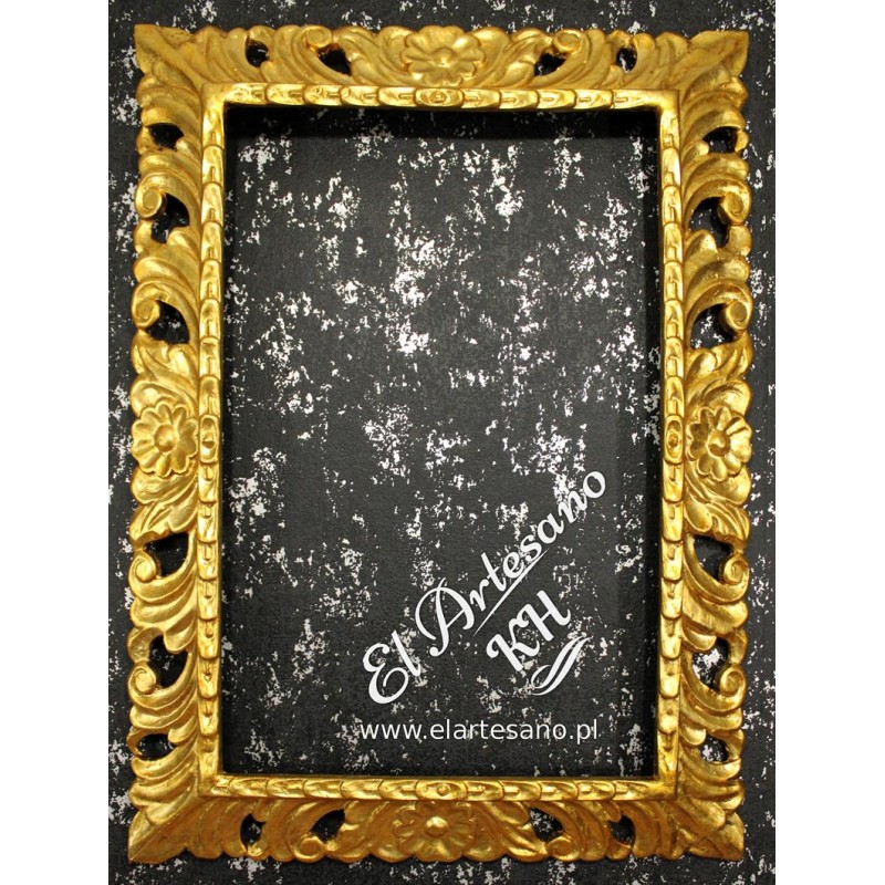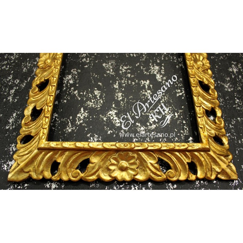 Stylowa rama ażurowa wykonana na bazie drewna cedrowego z ręcznie rzeźbionymi ornamentami. Pokryta płatkami złota (szlagmetal) precyzyjną techniką pozłotniczą.