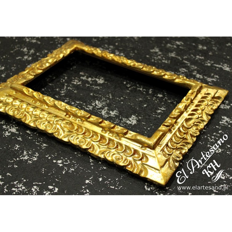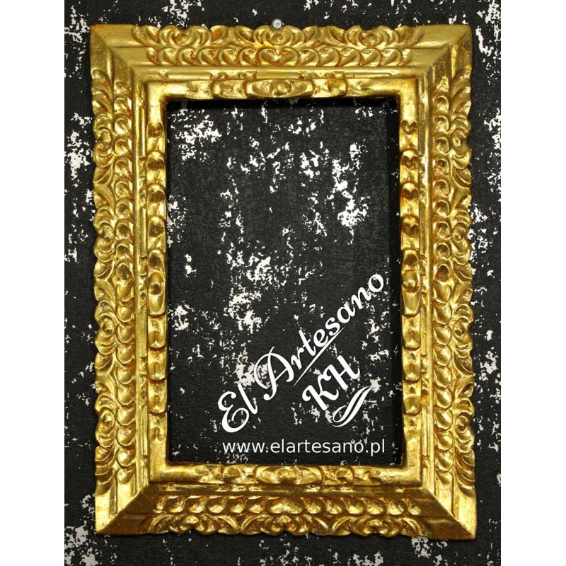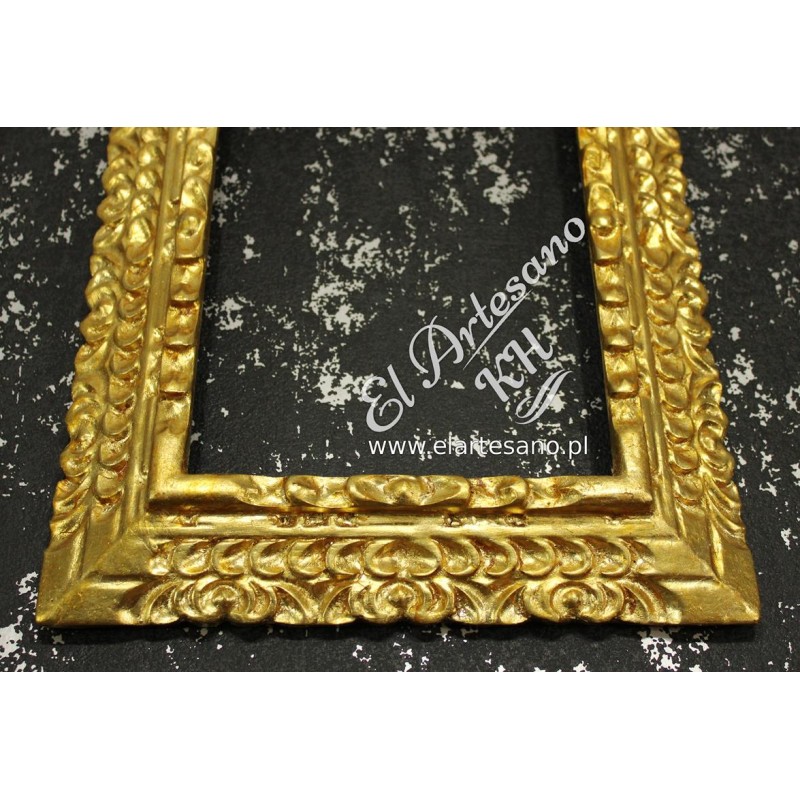 Rama stylowa wykonana na bazie drewna cedrowego z ręcznie rzeźbionymi ornamentami. Pokryta płatkami złota (szlagmetal) precyzyjną techniką pozłotniczą.