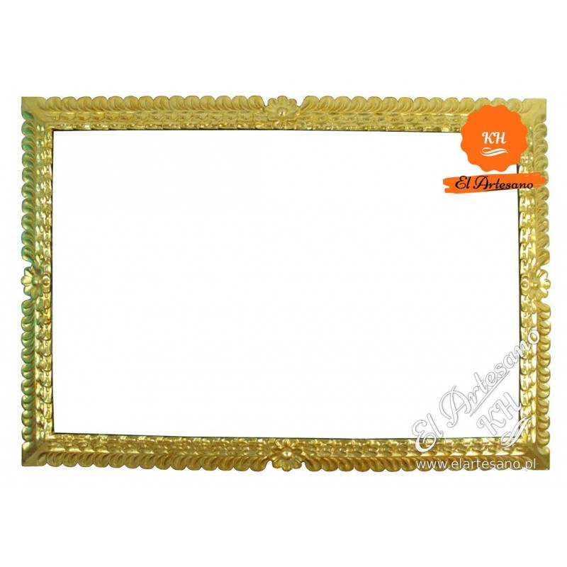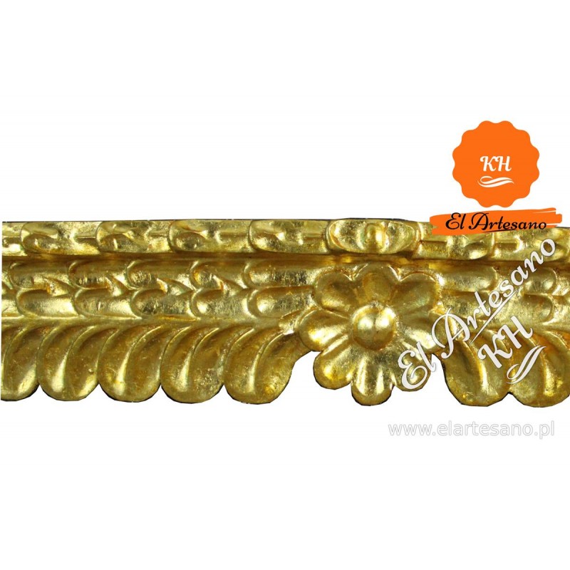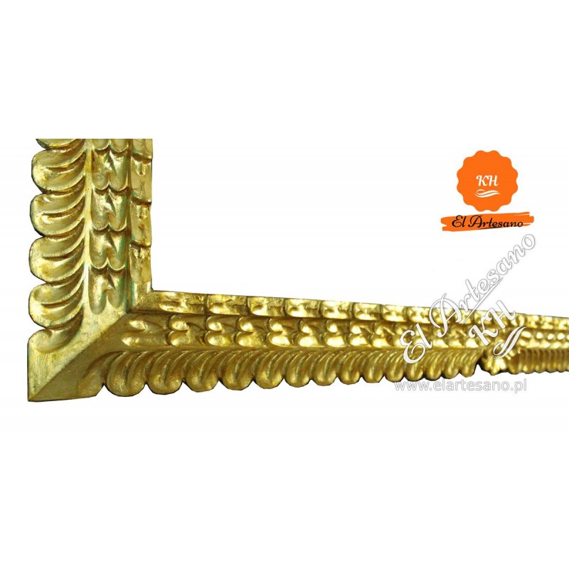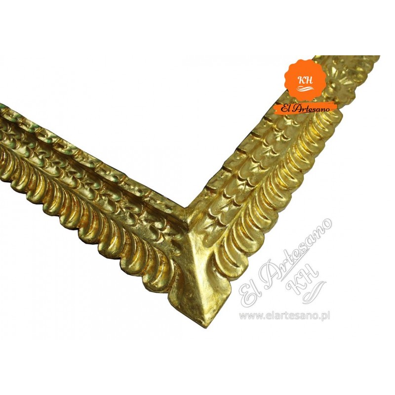 Rama stylowa wykonana na bazie drewna cedrowego z ręcznie rzeźbionymi ornamentami. Pokryta płatkami złota (szlagmetal) precyzyjną techniką pozłotniczą.